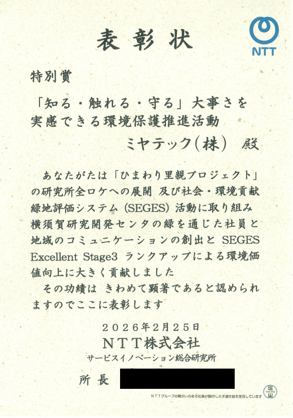 NTT研究所様より環境保護推進活動の特別賞をいただきました。